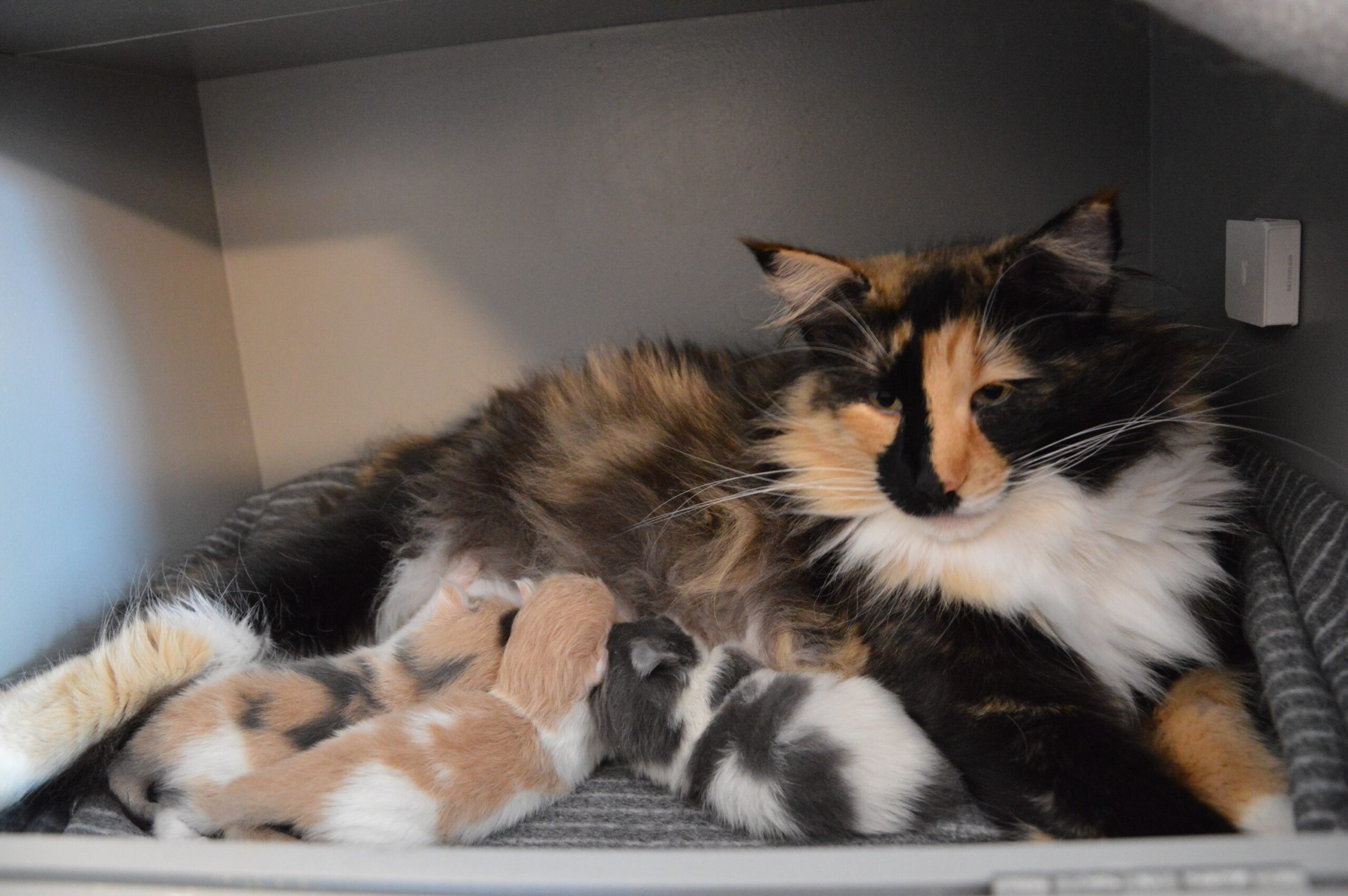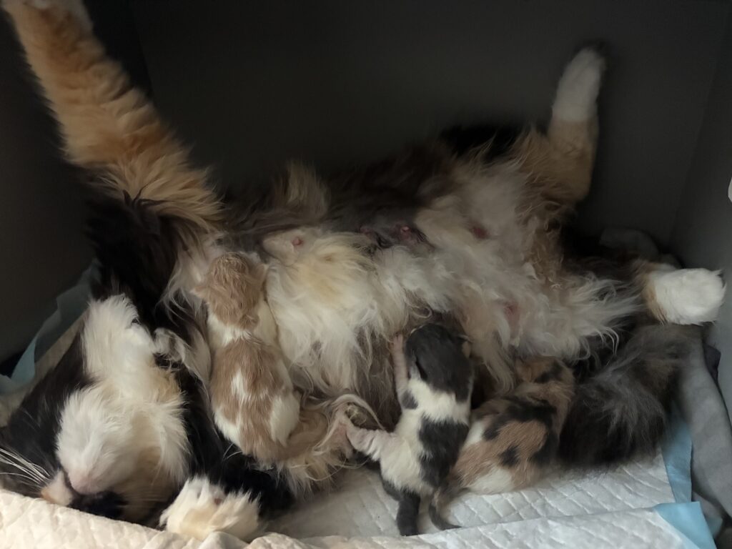Lørdag d. 11 april 2026 kom der endelig killinger i huset igen, og efter en ukompliceret og nem fødsel, skulle vi se hvad en vægtøgning på 2,4 kg kunne resultere i. Harleen blev mor til hendes første kuld, et skønt lille trekløver i de flotteste farver <3